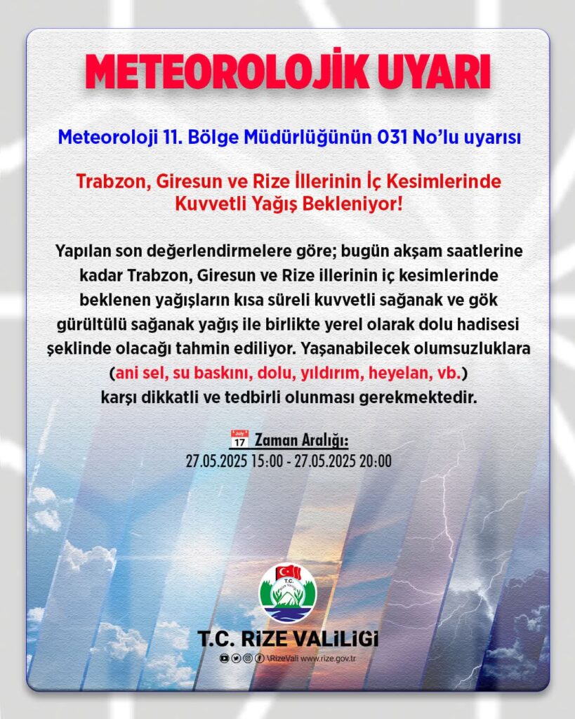 Rize Valiliği uyardı bugün akşam saatlerinde gök gürültülü kuvvetli yağmur geliyor.