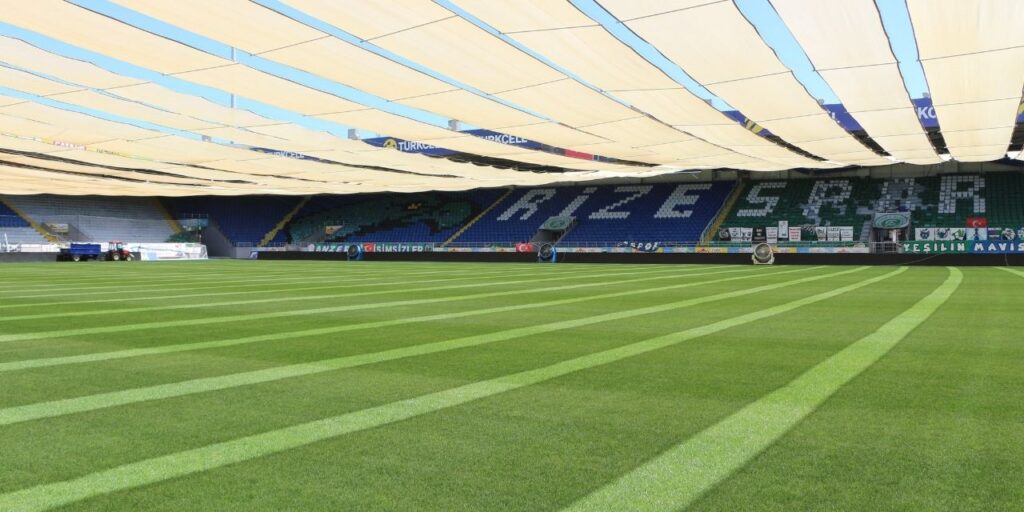 Çaykur Rizespor As Başkanı Fatih Kızıltan, geçtiğimiz yıl yenilenen çim zeminin korunması adına böyle bir adım attıklarını dile getirerek, “Futbolda çim kalitesi; oyuncu sağlığını, oyun kalitesini ve maçın performansını doğrudan etkileyen en önemli faktördür. Bu bağlamda geçen yıl yaklaşık 1 milyon 257 bin Euro yatırımla çimin altyapısını, çim zeminini tamamen değiştirdik. Türkiye’nin en çok yağış alan bölgesi olan ilimizde stadın zeminini korumak adına yaz tedbirlerini uygulamaya koyduk. Gördüğünüz üzere şu anda yaklaşık olarak vinç yardımıyla 36 tane gölgelendirme sistemi kurduk. Bu sistemin en büyük avantajı, yaz döneminde yaklaşık 10 derecelik bir fark oluşturuyor. Aynı zamanda yağmurlu havalarda hızlı bir şekilde katlanabiliyor. Aynı zamanda da güneşin açısına göre şekil değiştirebiliyor. Dolayısıyla stadımızı bu şekilde korumuş oluyoruz. Yaz güneşinin de aşırı sıcak, aşırı güneş çimde kurumaya ve yanmaya sebep oluyor. Aynı zamanda da aşırı nem çimde çürümeye sebep oluyor. Dolayısıyla gölgelendirme sisteminin esas amacı güneşten stat zeminini korumak” ifadelerini kullandı.