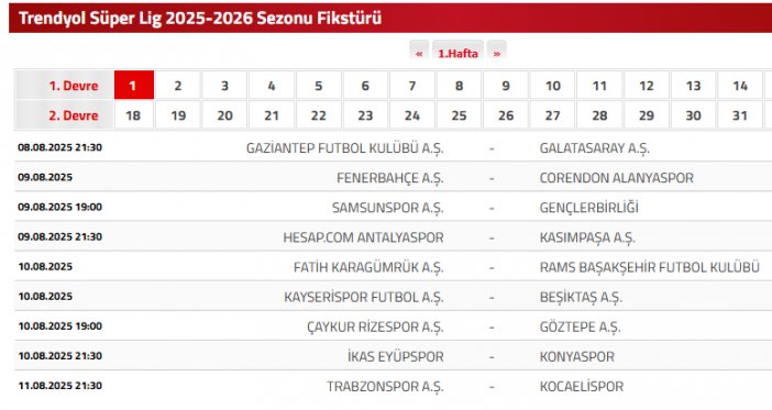 Sezonun açılış karşılaşmasında son şampiyon Galatasaray, deplasmanda Gaziantep FK ile karşı karşıya gelecek. Haftanın kapanış mücadelesinde ise Trabzonspor, Süper Lig’e bu sezon yükselen Kocaelispor’u ağırlayacak.