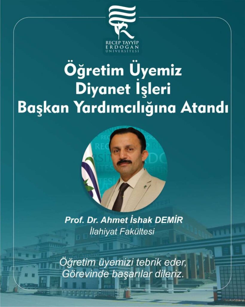 Cumhurbaşkanlığı tarafından 3 Ekim 2025 tarihli ve 2025/376 sayılı karar ile yayımlanan Resmî Gazete’de, RTE Üniversitesi İlahiyat Fakültesi Öğretim Üyesi Prof. Dr. Ahmet İshak Demir, Diyanet İşleri Başkan Yardımcılığı görevine atandı.