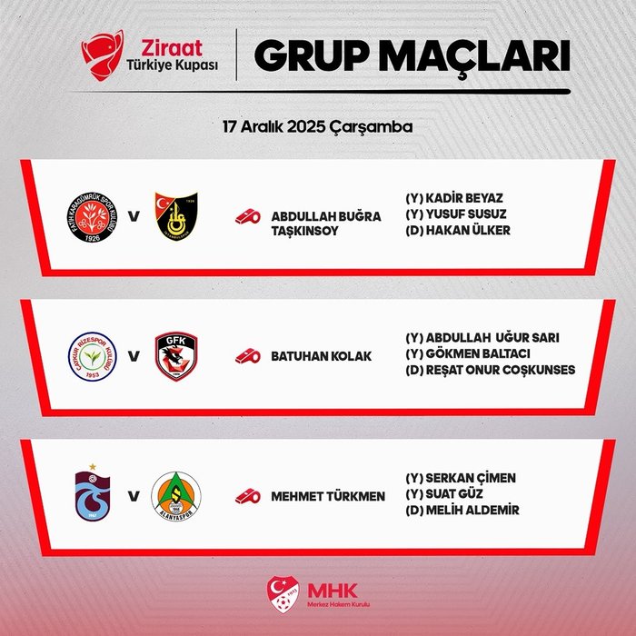 Ziraat Türkiye Kupası’nda 17 Aralık Çarşamba ve 18 Aralık Perşembe günü oynanacak maçların hakemleri açıklandı. İşte detaylar…